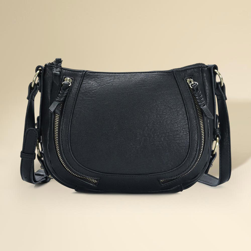 • Functional crossbody bag featuring dual zippered front pockets, braided pull accents, and an adjustable strap for versatile wear. Designed for daily use with a compact, stylish profile and practical storage.