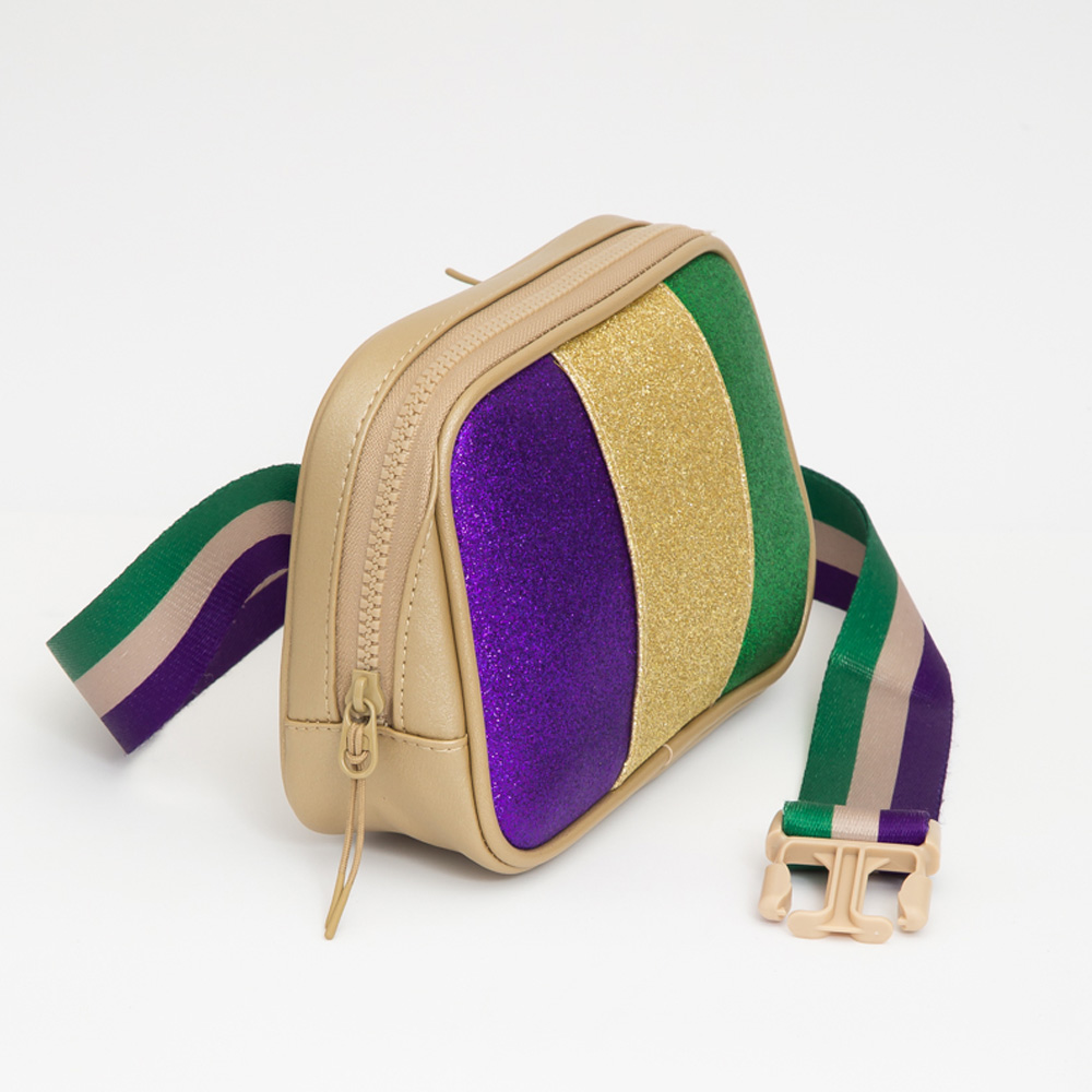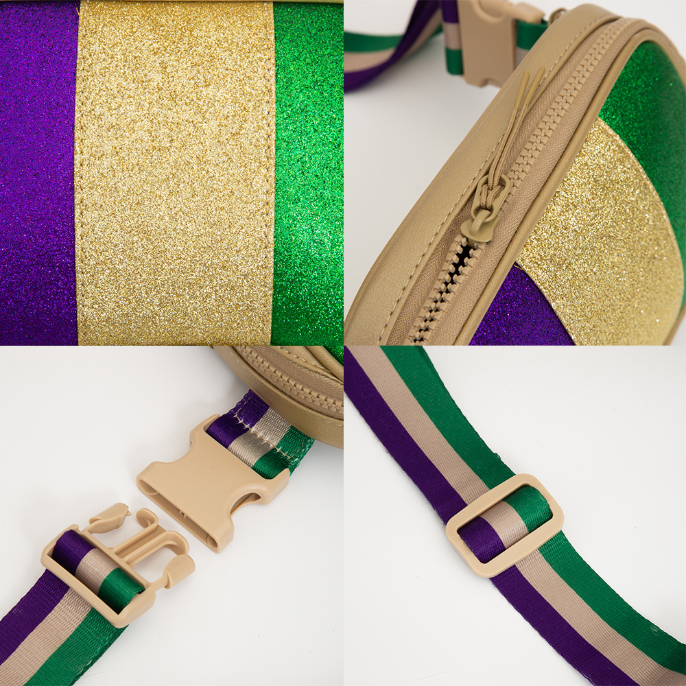 Details • Size : 8" X 6" X 2.5" • Strap Size : Adjustable • One Outside Zipper Pocket • Three Inside Slip Pocket • Zipper Closure • Celebrate in style with this glittery Mardi Gras belt bag featuring festive stripes and an adjustable strap. Perfect for parades, parties, and hands-free fun.