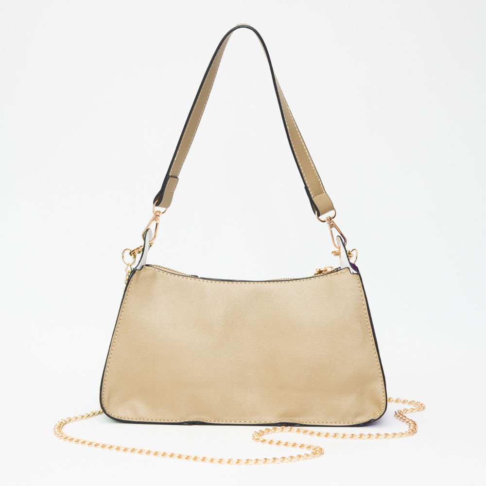 • Stylish tri-color mardi gras shoulder bag featuring bold glitter panels and a sleek zip closure. Accented with a detachable gold-tone chain strap and comfortable shoulder handle, this sparkling design adds festive flair to evening outfits, parties, or special celebrations.