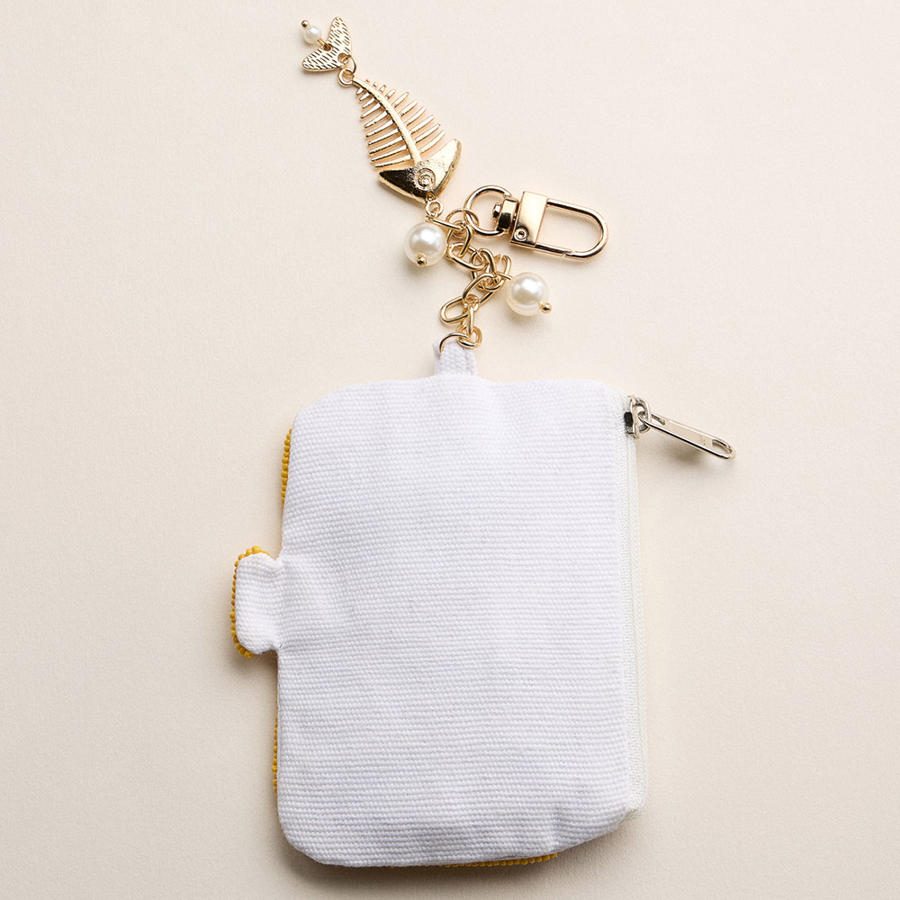 Details • Size : 3.75" X 4" (appx), 5" L • No Inside Pocket • Beads On Front Only • Bag Only (items are not included) • Zipper Closure • Playful sardines themed beaded zipper pouch with attached keychain clip, designed to hold coins, cash, cards, earbuds, or small daily essentials. Compact novelty accessory for handbags, backpacks, gift shops, beach collections, and eye catching impulse buy displays. • Made In India