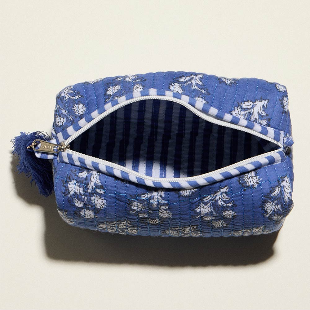 Details • Size : 6.5" X 4" X 3" • Zipper Closure • Quilted floral cosmetic pouch designed to organize makeup, skincare, and daily essentials with ease. Features a softly structured shape, secure zip closure, and decorative tassel accent. Compact yet spacious for travel, handbags, or vanity use, making it a stylish and practical storage solution or gift option.