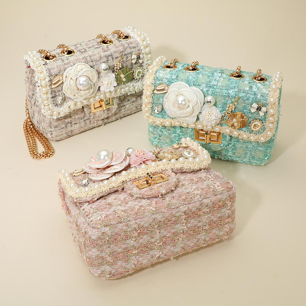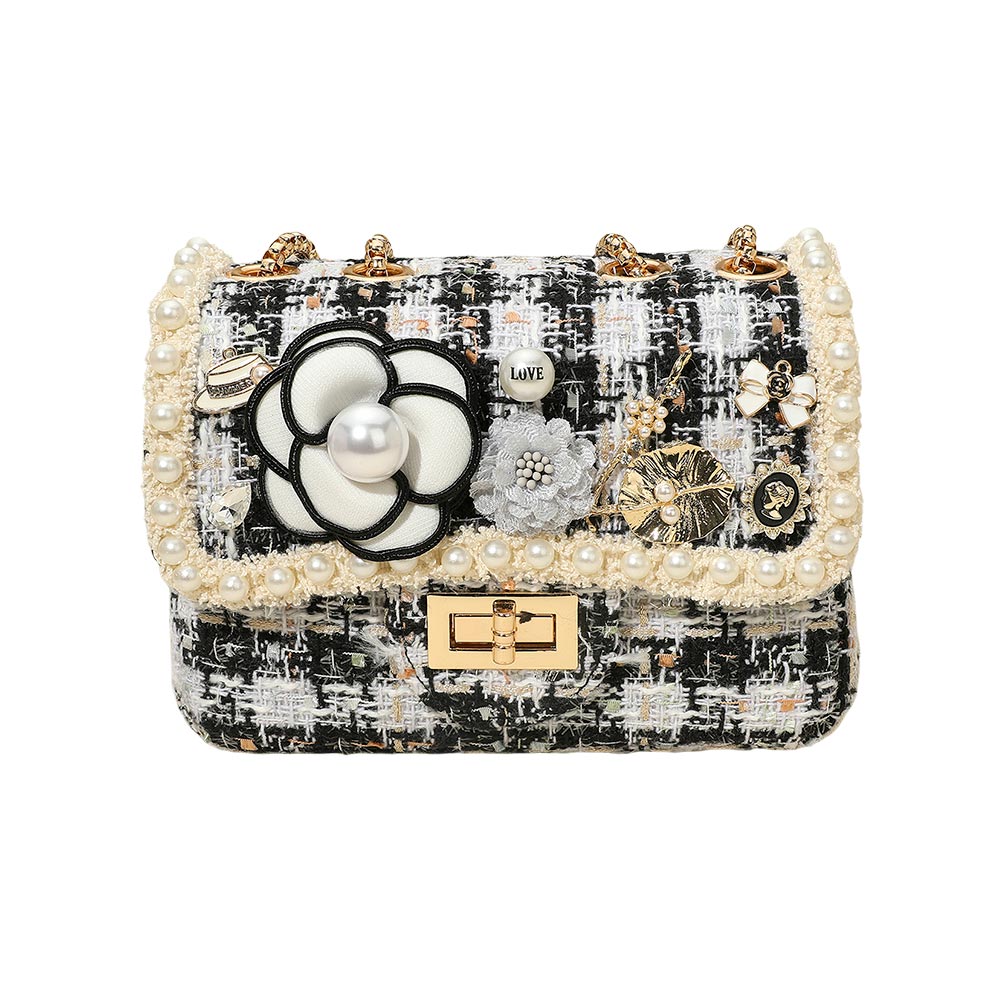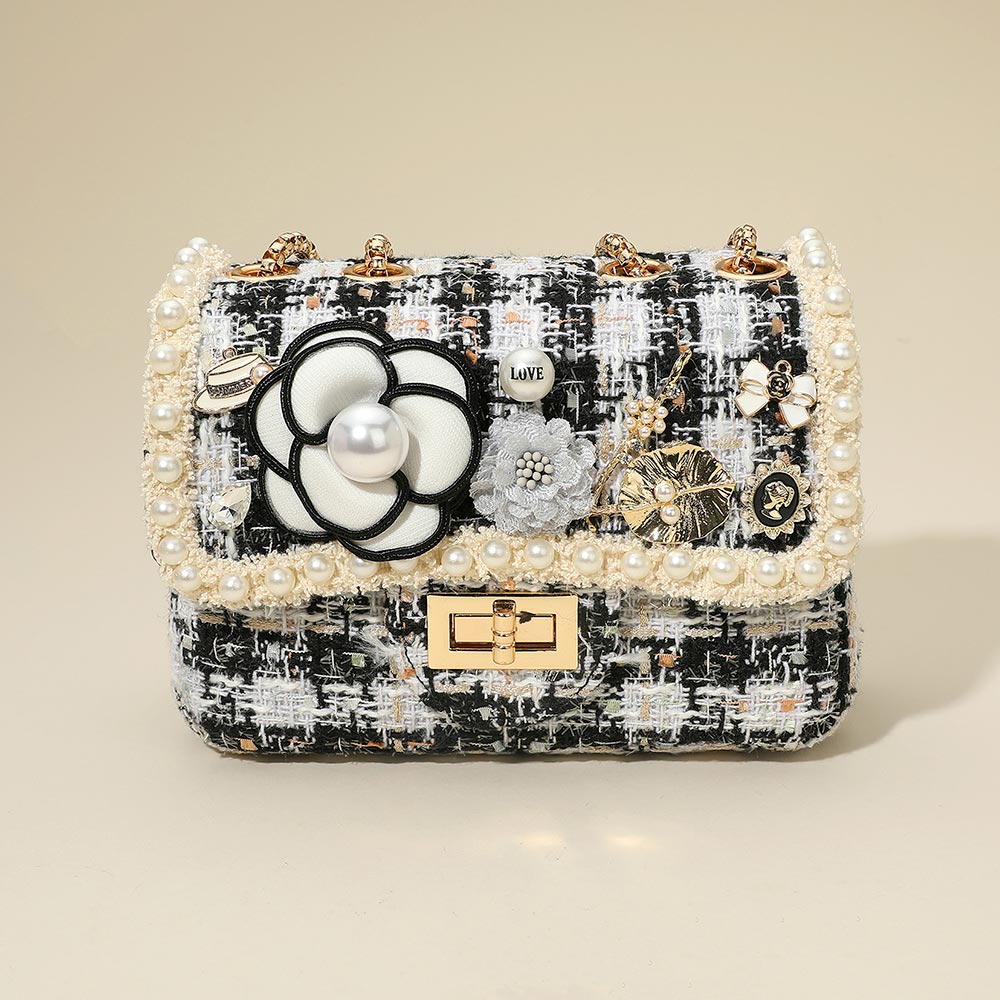 • Elevate your look with this tweed shoulder bag featuring pearl trim, floral appliquĂ©, and delicate jeweled accents. Complete with a twist-lock closure and chain strap, it combines charm and sophistication, making it perfect for parties, special occasions, or chic daily wear.