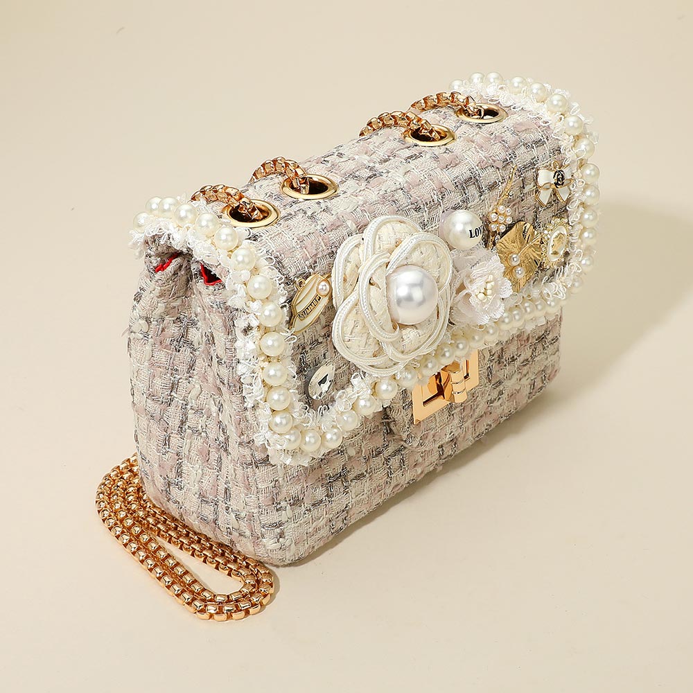 Floral Pearl Stone Cluster Leaf Embellished Tweed Handbag Crossbody Bag