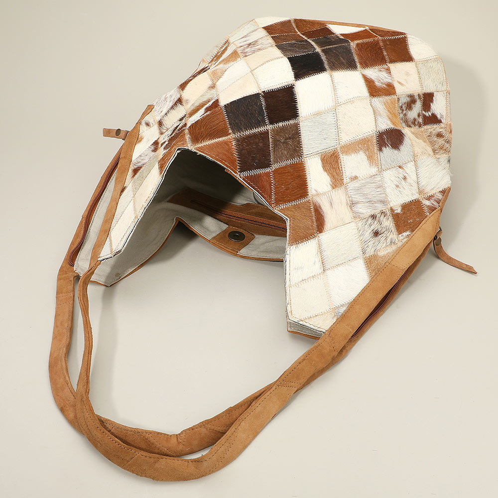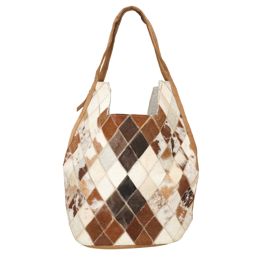 Details • Size : 16" X 15" X 6.5" • Shoulder Strap Size : 10" L • One Inside Zipper Pocket • Magnetic Closure • Eye-catching shoulder bag featuring a geometric diamond patchwork pattern for a unique textured look. The slouchy rectangular body and wide, soft handles provide comfort and style, making it ideal for daily use or as a standout accessory for casual outings.