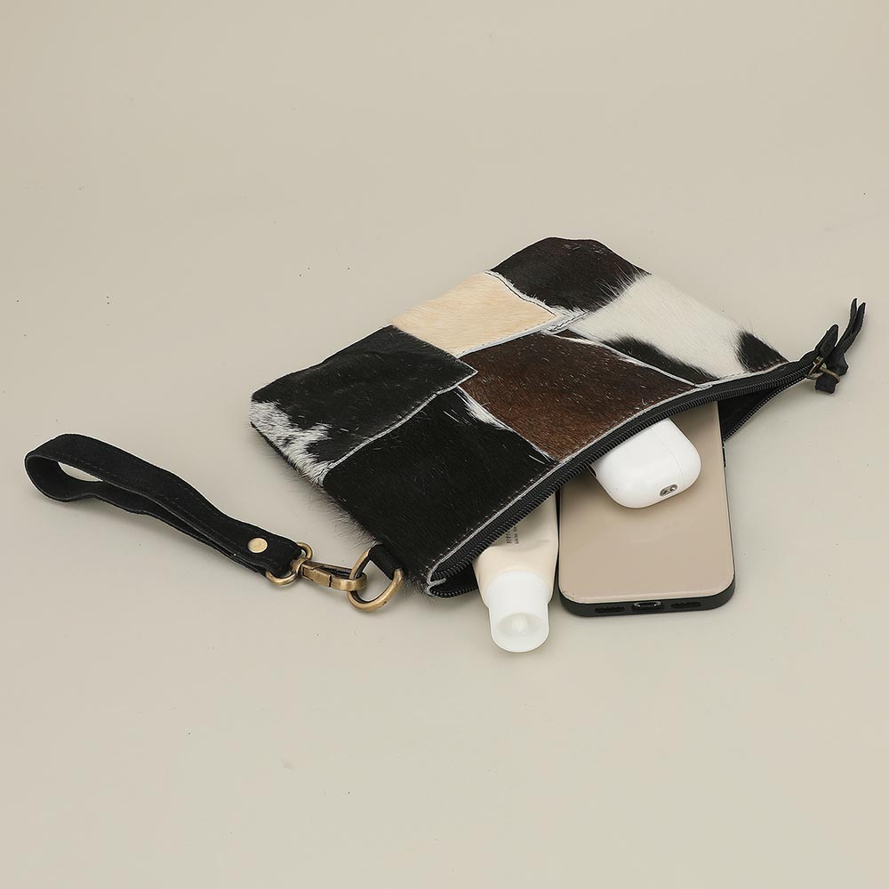 Details • Size : 8.75" X 7" • Wristlet Size : 8" L • Zipper Closure • Stylish cowhide wristlet pouch clutch with patchwork front, secure zip closure, and detachable strap. Compact yet spacious enough for phone, keys, and daily essentials. Perfect for travel, errands, or organizing items inside larger bags with a chic, functional touch. • Made In India