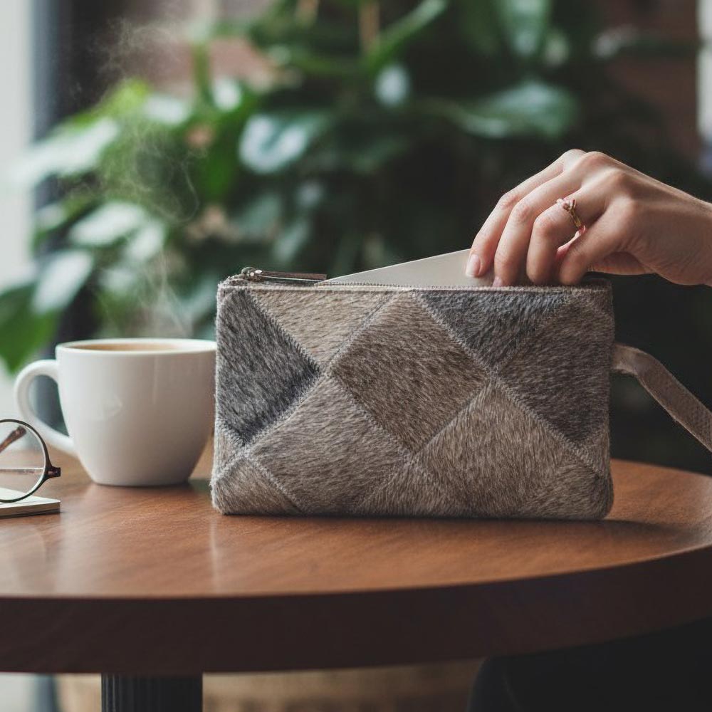 Details • Size : 8" X 5" • Wristlet Size : 5.5" L • Shell : 100% Leather • Inner Lining : 100% Cotton • Zipper Closure • This genuine leather calf hair patchwork wristlet clutch combines chic style and everyday function. Featuring a secure zipper closure with interior space for your phone, cards, keys, and earbuds, it’s the perfect lightweight grab-and-go accessory. Its neutral tones pair effortlessly with any outfit for casual days, coffee runs, and nights out. • Made In India