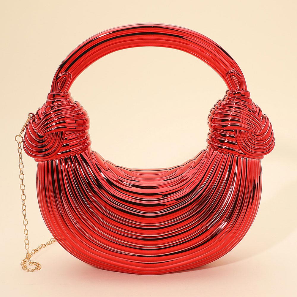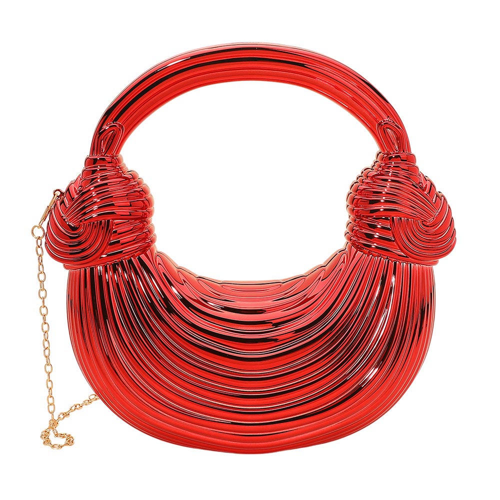• This sculpted fashion bag features a distinctive loop-handle silhouette with layered, curved ridges that create a bold, fluid shape. A sleek chained detail adds versatility, making it an expressive accessory that elevates evening outfits and modern, statement-driven looks.