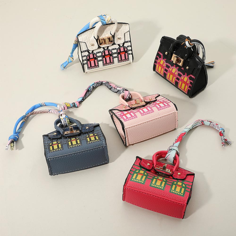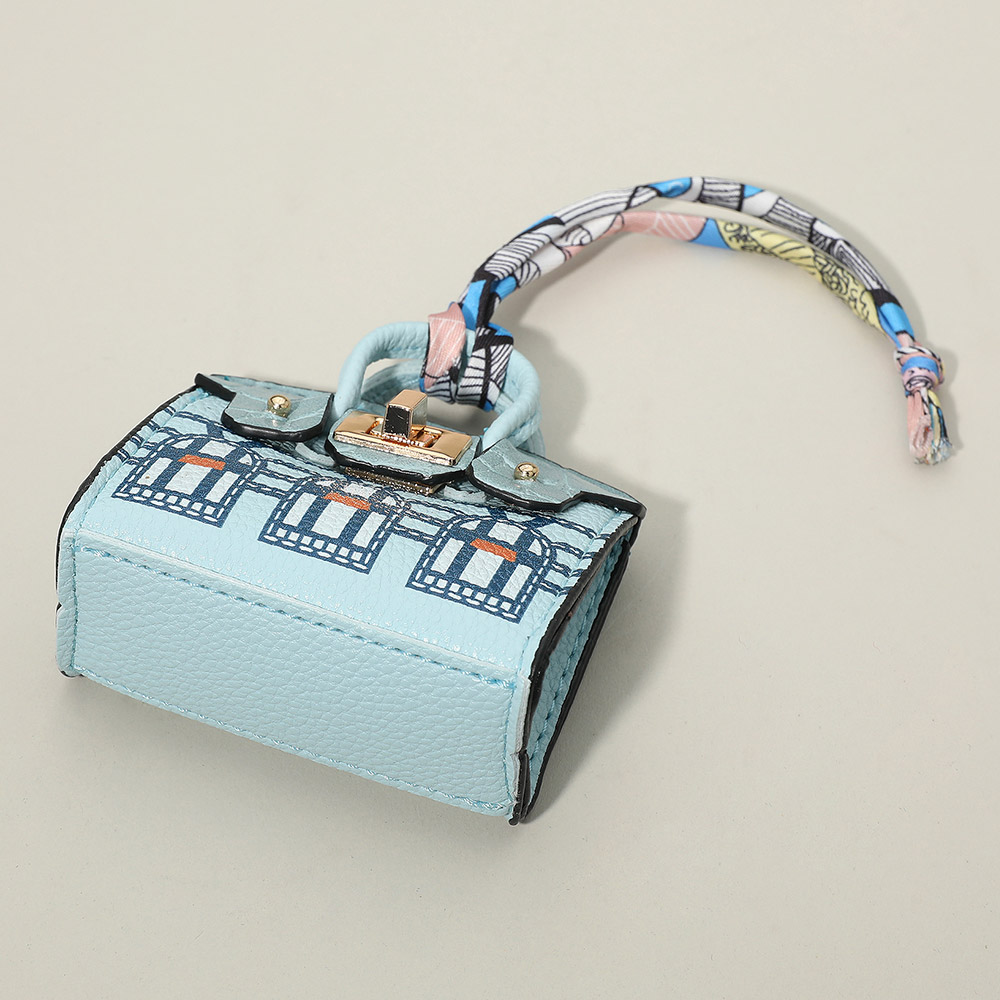 • Add a fun touch to your look with this mini printed handbag keychain. Featuring a detailed window pattern and scarf accent, it's a stylish charm for bags or keys with a playful twist and functional clasp.