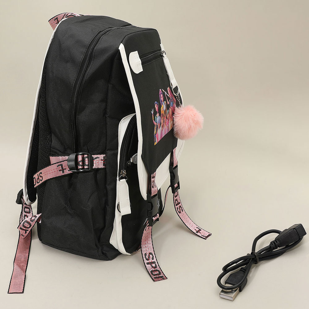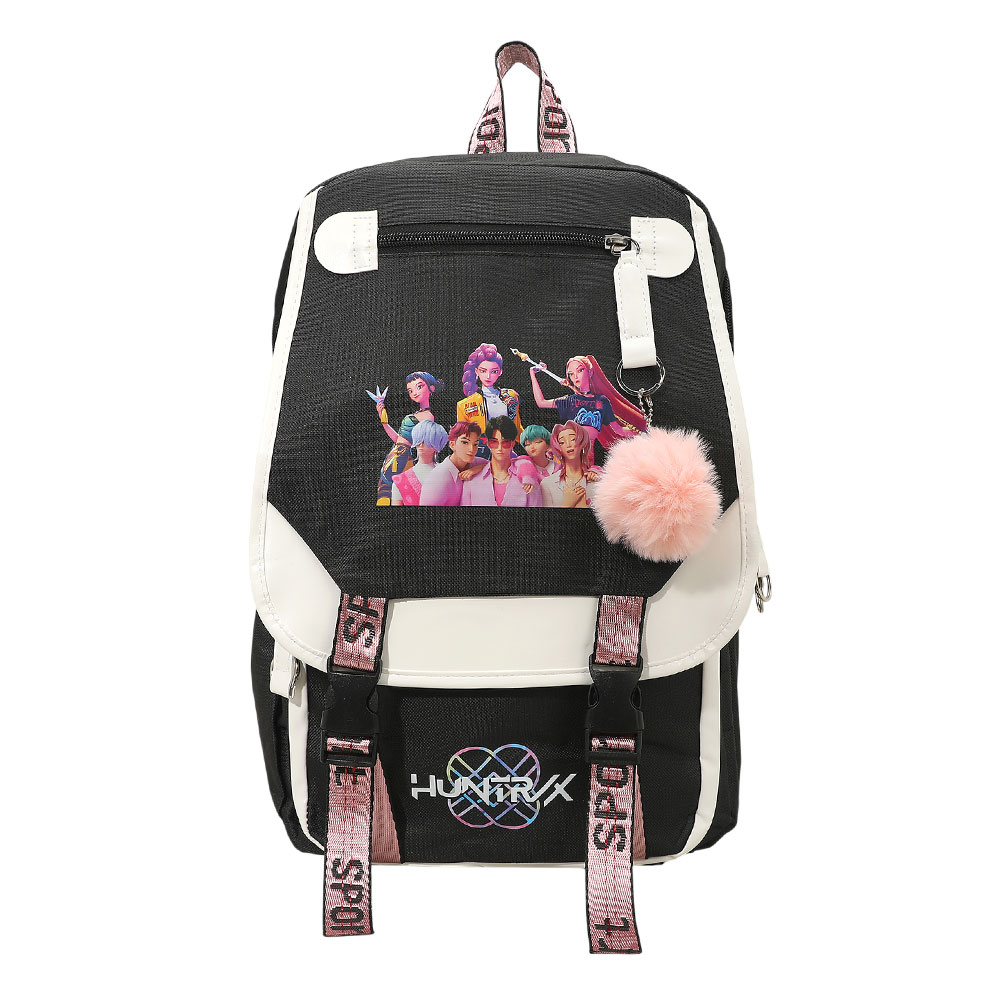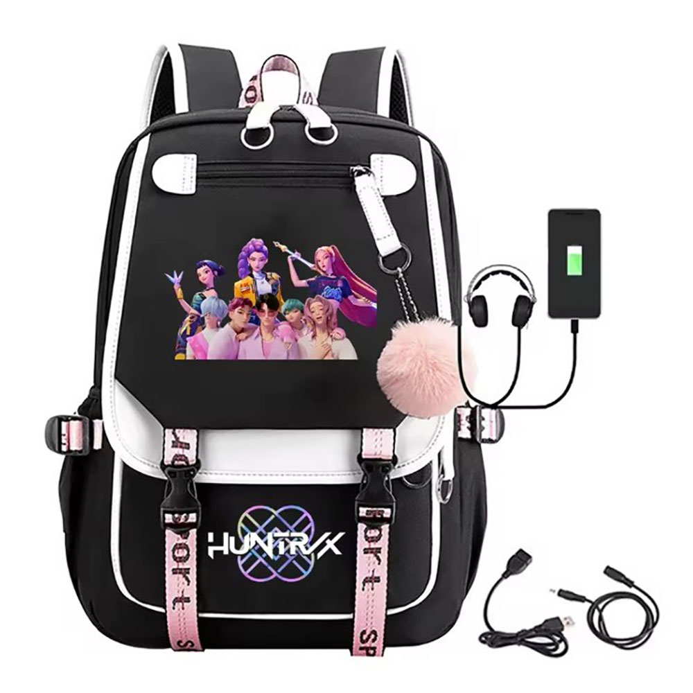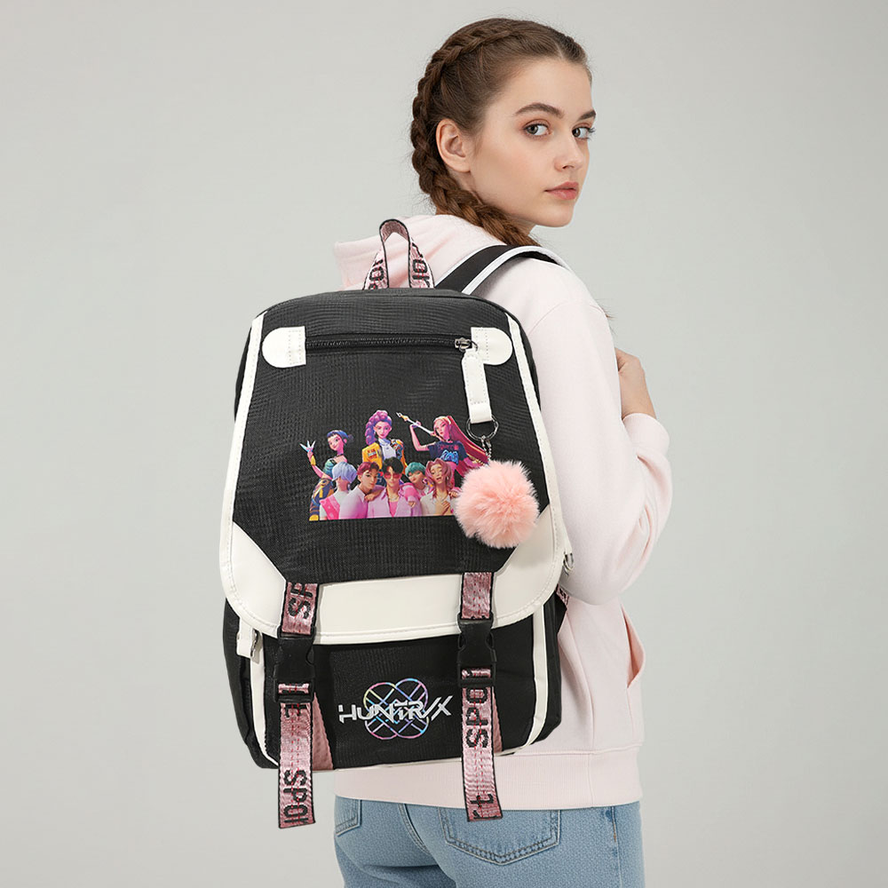 Details • Size : 10.5" X 15.5" X 4.75" • Pom Pom Size : 2.75" X 3" • USB Size : 19.5" • Strap Size : Adjustable • 5 Inside Slip Pockets / Pen Holders • 3 Outside Zipper Pockets • Zipper Closure • Stylish K-Pop Demon Hunters backpack designed for fans who want bold character graphics with everyday practicality. Features spacious compartments, secure closures, and functional details ideal for school, travel, or daily use. A must-have pop culture backpack that stands out in retail displays and gift collections.