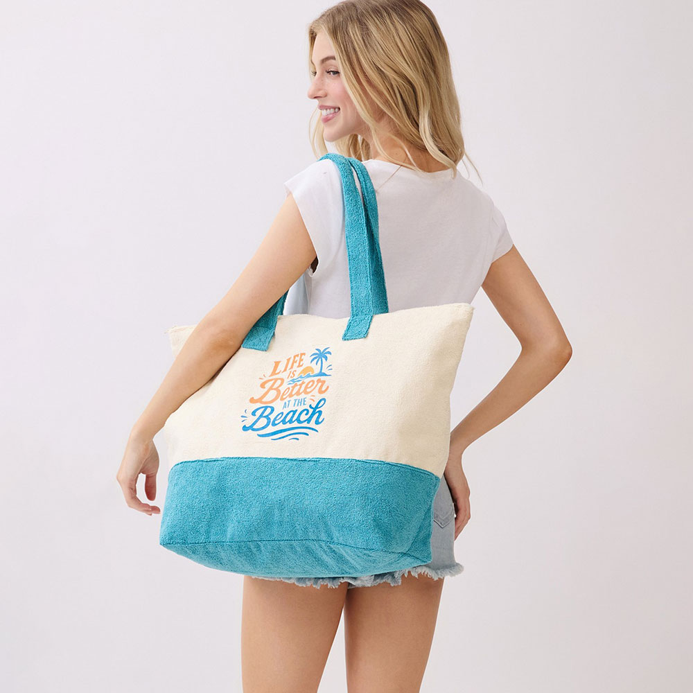 Details • Size : 22" X 16" X 6" • Inner Pocket • Zipper Closure • Material : 80% Polyester, 20% Polyamide • Beach themed graphic tote bag featuring a cheerful “Life Is Better at the Beach” message. Designed for beach days, poolside outings, shopping, or vacation travel, this roomy tote offers easy carrying for daily essentials while adding a relaxed coastal vibe to summer looks.