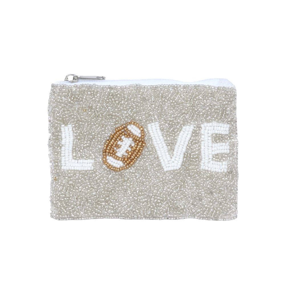 Details • Size : 5" X 3.75" (appx) • No Inside Pocket • Beads On Front Only • Bag Only (items are not included) • Zipper Closure • Celebrate your love for the game with this beaded coin pouch featuring a playful “LOVE” design accented by a football motif. Perfect for carrying small essentials, it adds a fun, spirited touch to everyday outfits while keeping your items secure and easy to access. • Made In India