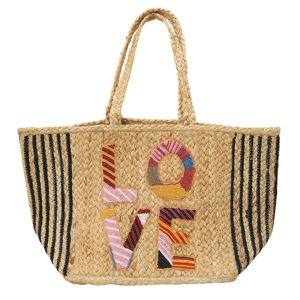 Details • Size : 19.5" X 11.5" X 8.25" • Top Handle Size : 7.5" L • Statement woven tote bag featuring bold LOVE lettering with decorative detailing for a playful, eye-catching look. Spacious interior easily carries daily essentials, making it ideal for shopping, travel, or casual outings. Lightweight yet structured, this tote is perfect for boutiques seeking expressive, trend-forward statement bags. • Made In India