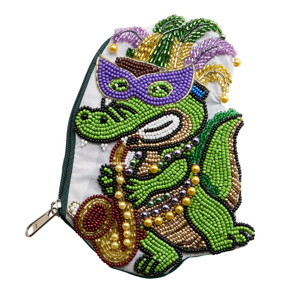 Details • Size : 4.25" X 5.5" (appx) • No Inside Pocket • Beads On Front Only • Bag Only (items are not included) • Zipper Closure • Festive zipper pouch featuring a playful alligator character inspired by Mardi Gras celebration themes. Designed for storing cosmetics, coins, keys, or small accessories, this novelty pouch adds fun personality to seasonal collections, party assortments, gift shops, and festival-focused retail displays while offering practical everyday organization. • Made In India