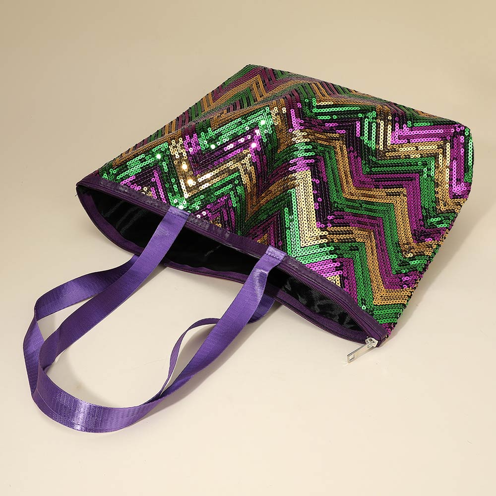 Details • Size : 18" X 13" X 6" • Top Handle Size : 11.5" L • Zipper Closure • Eye catching chevron sequin tote bag designed for festivals, themed events, travel, and everyday statement wear. Features a secure zipper closure, spacious interior, and comfortable shoulder straps. A strong boutique pick for seasonal displays, giftable collections, and customers looking for bold, functional fashion accessories.