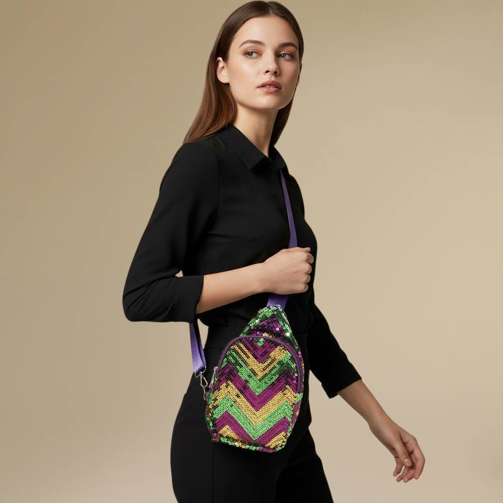 Details • Size : 6.25" X 11.25" X 3.2" • Strap Size : Adjustable • Zipper Closure • Statement chevron sequin sling backpack designed for festivals, themed events, travel, and hands free everyday use. Features a secure zipper closure, adjustable strap, and compact yet functional interior for essentials. A strong boutique option for seasonal promotions, party displays, and customers seeking bold fashion accessories with practical wearability.