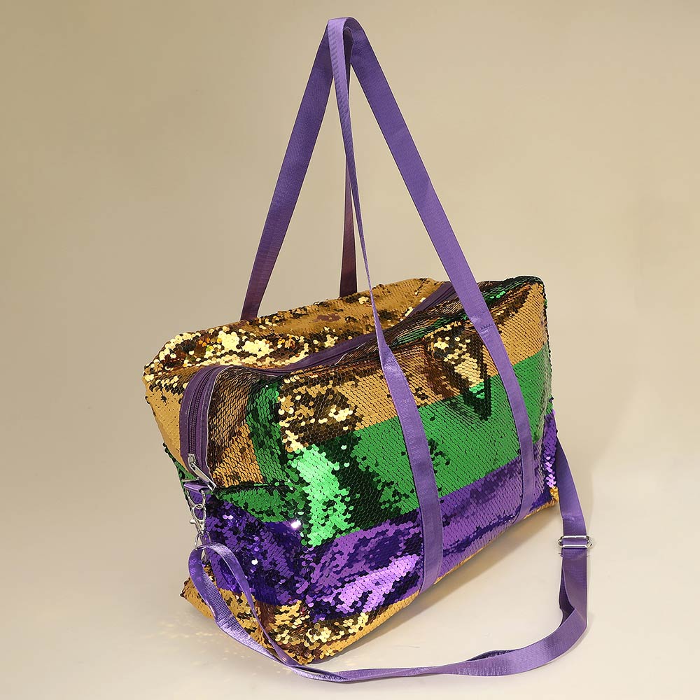 Details • Size : 16.75" X 11.75" X 6.5" • Top Handle Size : 11" L • Strap Size : 59" L • Zipper Closure • Statement duffle tote bag designed for travel, events, and weekend use. Features a spacious main compartment, dual carry handles, and an adjustable shoulder strap for versatile wear. Ideal for festival styling, themed celebrations, gifting, or boutique displays with eye catching texture and bold fashion appeal.
