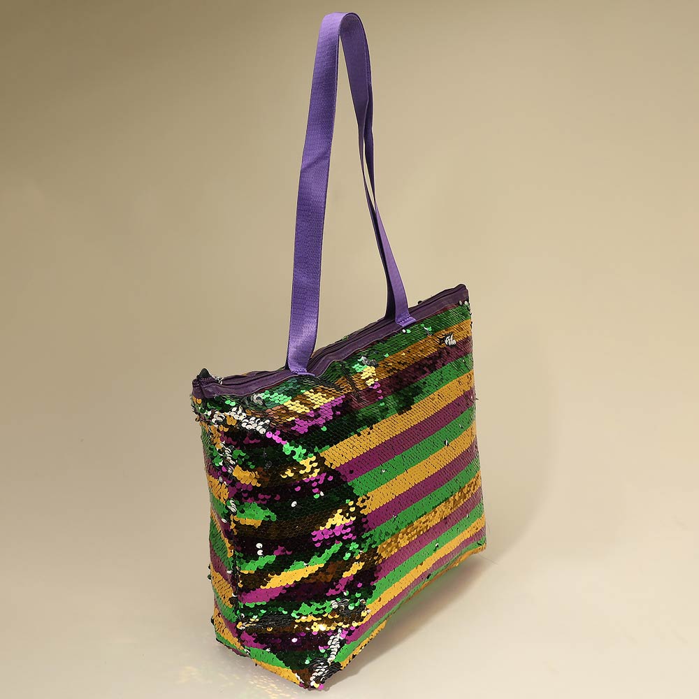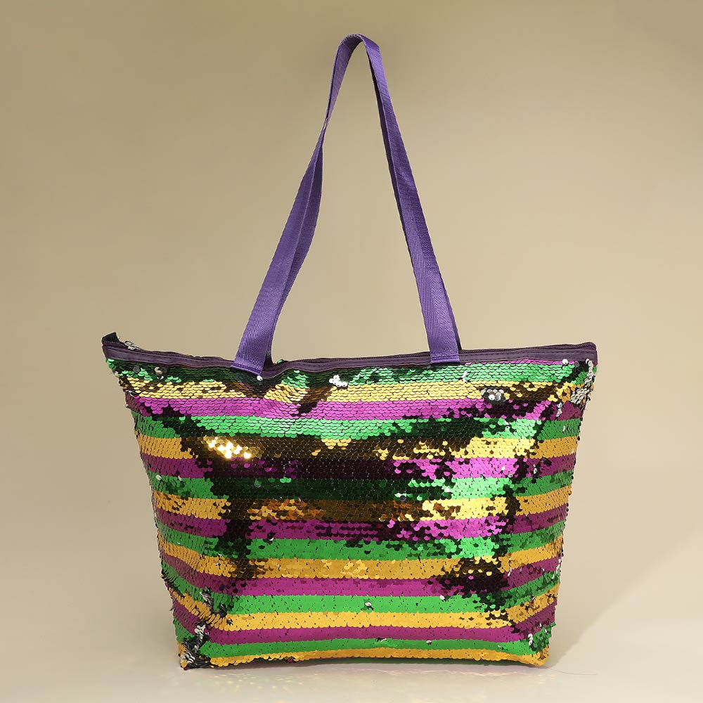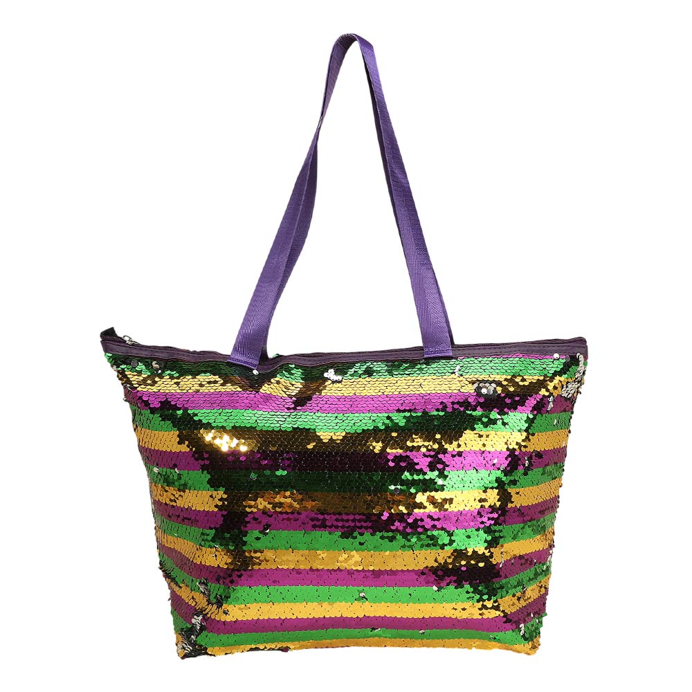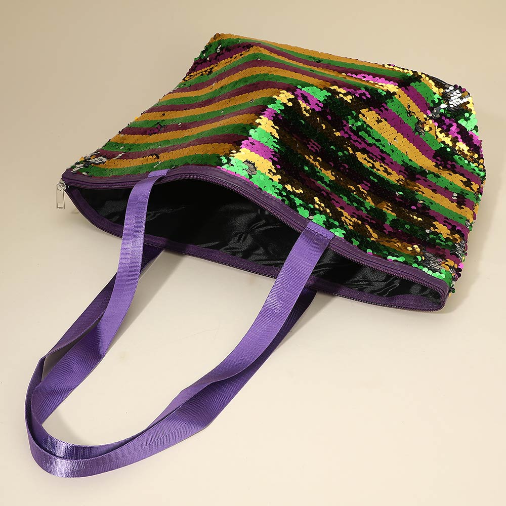 Details • Size : 18" X 13" X 6" • Top Handle Size : 11.5" L • Zipper Closure • Bold sequin tote bag designed for festivals, themed events, travel, and everyday statement looks. Features a secure zipper closure, roomy interior, and comfortable shoulder straps. Ideal for boutiques, gifting, seasonal promotions, and customers seeking eye catching fashion accessories that stand out while remaining practical.