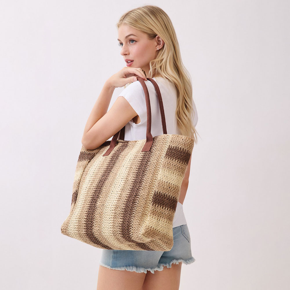 Details • Size : 21" X 14" X 6" • Inner Pocket • Magnetic Snap Closure • Material : 100% Paper • Spacious striped tote bag designed for everyday use, travel, shopping, and weekend outings. Features a roomy open interior to carry essentials, clothing, or accessories with ease. Comfortable shoulder handles offer effortless wear, making it a versatile choice for boutiques, resort shops, and seasonal collections.