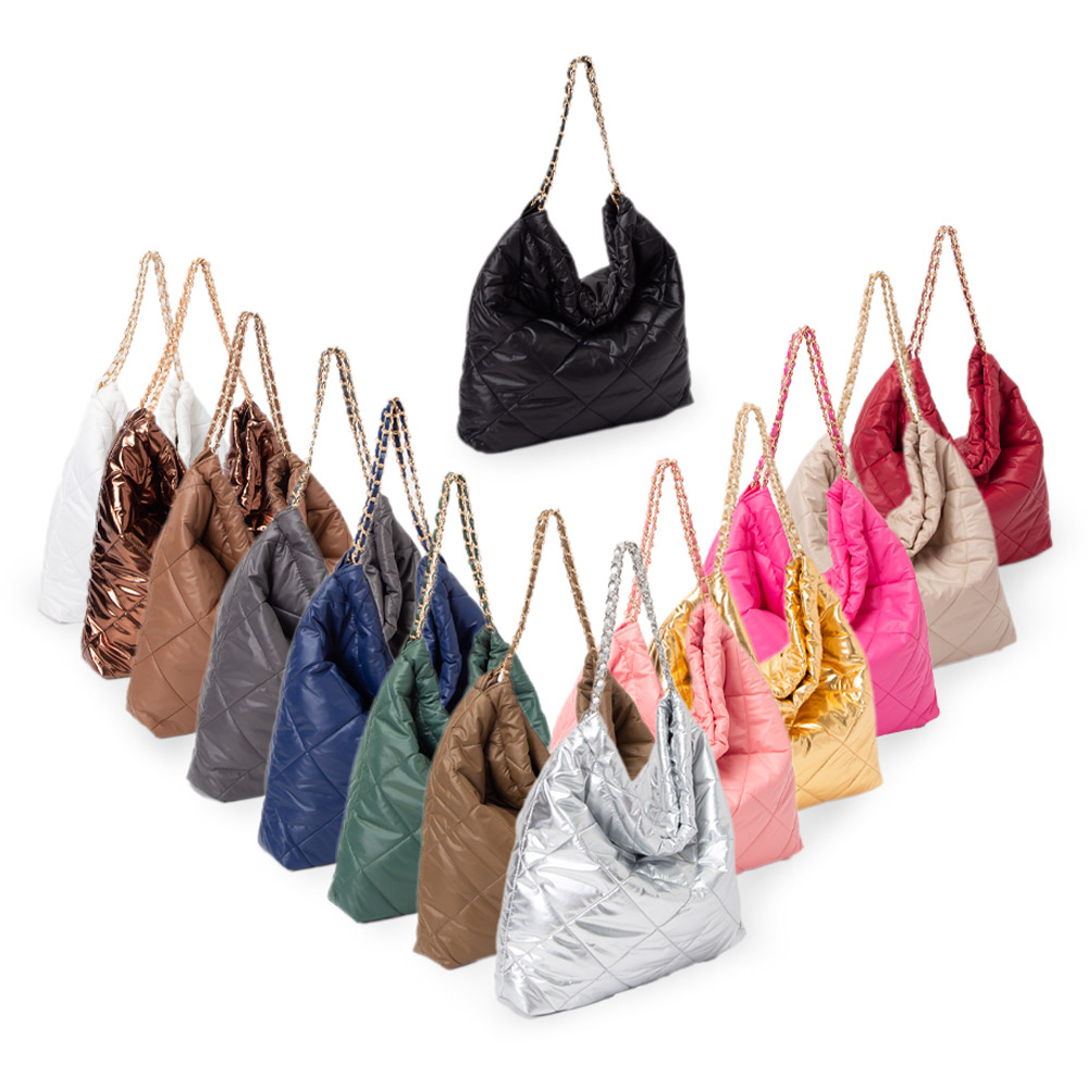 Details • Size : 13.4" X 13" X 3.5" • Strap : Adjustable • One Inside Zipper Pocket • One Inside Slip • Pocket • One Inside Pouch Bag (7.75" X 4.75", Zipper Closure) / Attachable • Elevate everyday style with this quilted oversized shoulder bag featuring a chic chain handle and a soft, slouchy silhouette. Spacious and versatile, it’s ideal for daily use, offering a fashionable blend of practicality and modern design for work, travel, or casual outings.