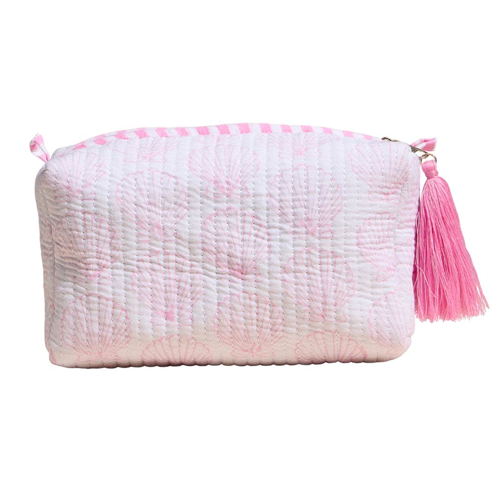 Details • Size : 6.5" X 4" X 3" • Zipper Closure • Quilted shell pattern cosmetic pouch designed for organizing makeup, toiletries, and small daily essentials. Features a softly padded structure, smooth zip closure, and tassel accent for added style. Compact yet roomy for travel, handbags, or vanity storage, making it a charming and practical accessory or gift option.