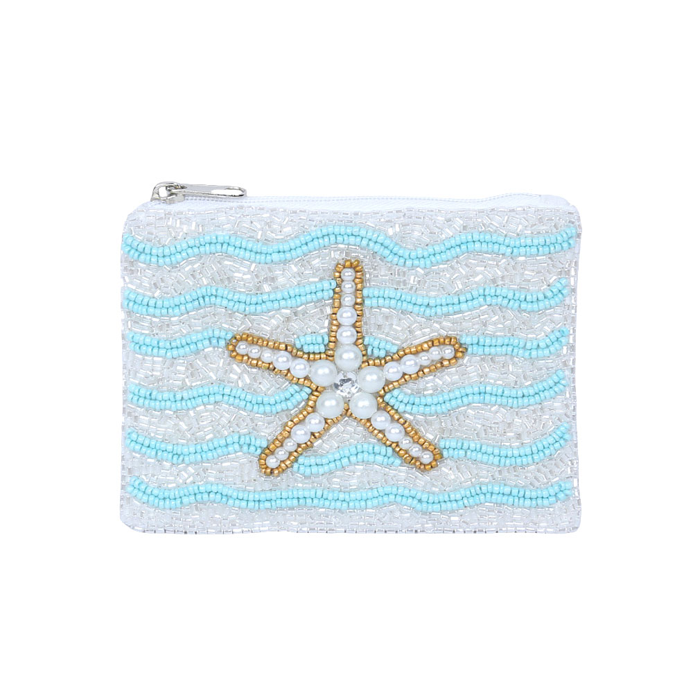 Details • Size : 5" X 3.75" (appx) • No Inside Pocket • Beads On Front Only • Bag Only (items are not included) • Zipper Closure • Embrace seaside charm with this intricately beaded coin pouch featuring a radiant starfish accent and wave-inspired detailing. Perfect for carrying small essentials, it adds a touch of coastal elegance to everyday outings and beach-ready looks with its eye-catching design. • Made In India