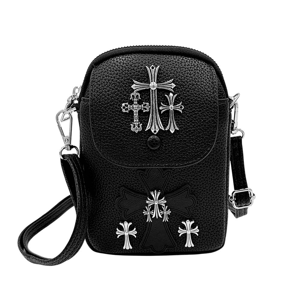 Details • Size : 5" X 7.1" X 1.4" • Strap Size : 54" L / Adjustable, Detachable • One Outside Snap Closure Slip Pocket • One Inside Slip Pocket • Zipper Closure • Material : 100% Polyurethane (Shell), 100% Polyester (Lining) • Compact mini crossbody bag designed with bold cross accents for a standout statement look. Ideal for hands-free wear while carrying daily essentials. Perfect for casual outings, travel, concerts, and streetwear styling with a strong, fashion-forward edge.