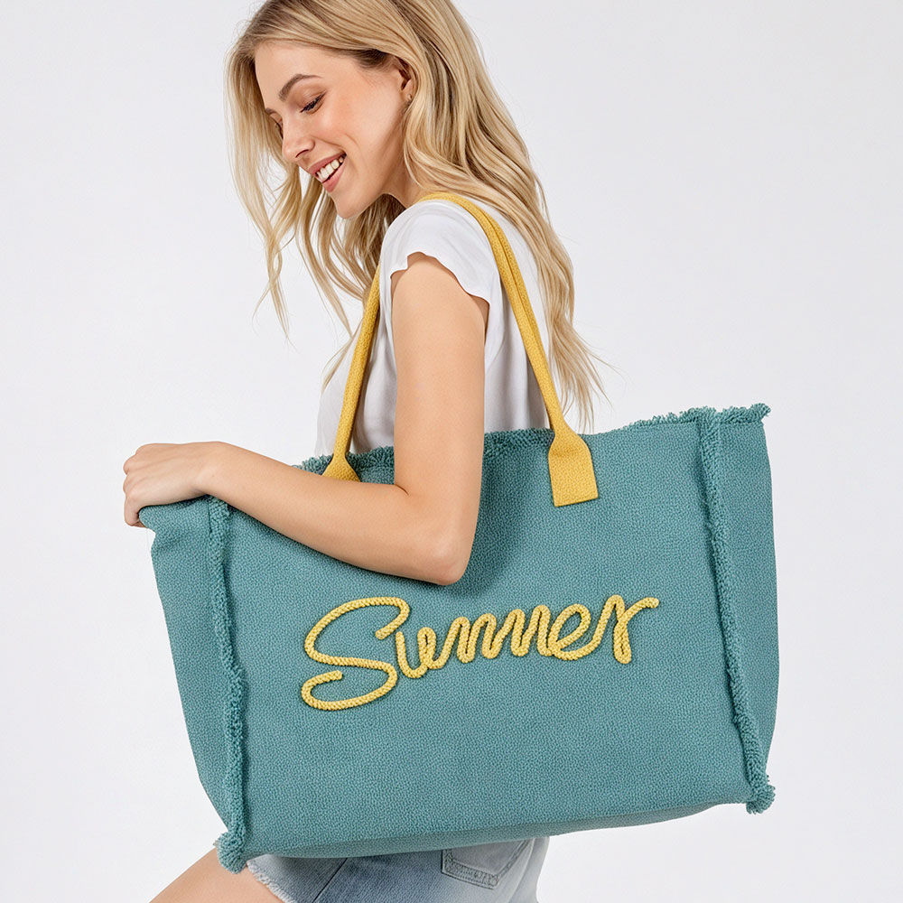 • Celebrate the season with this oversized "Summer" tote, showcasing bold text, contrast handles, and playful frayed edges. Ideal for beach trips, getaways, or casual everyday style with a fun twist.