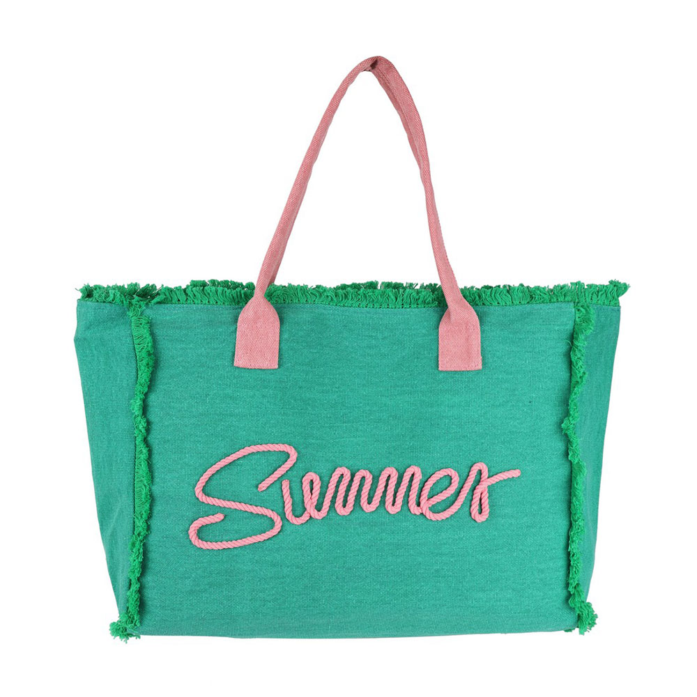 • Celebrate the season with this oversized "Summer" tote, showcasing bold text, contrast handles, and playful frayed edges. Ideal for beach trips, getaways, or casual everyday style with a fun twist.