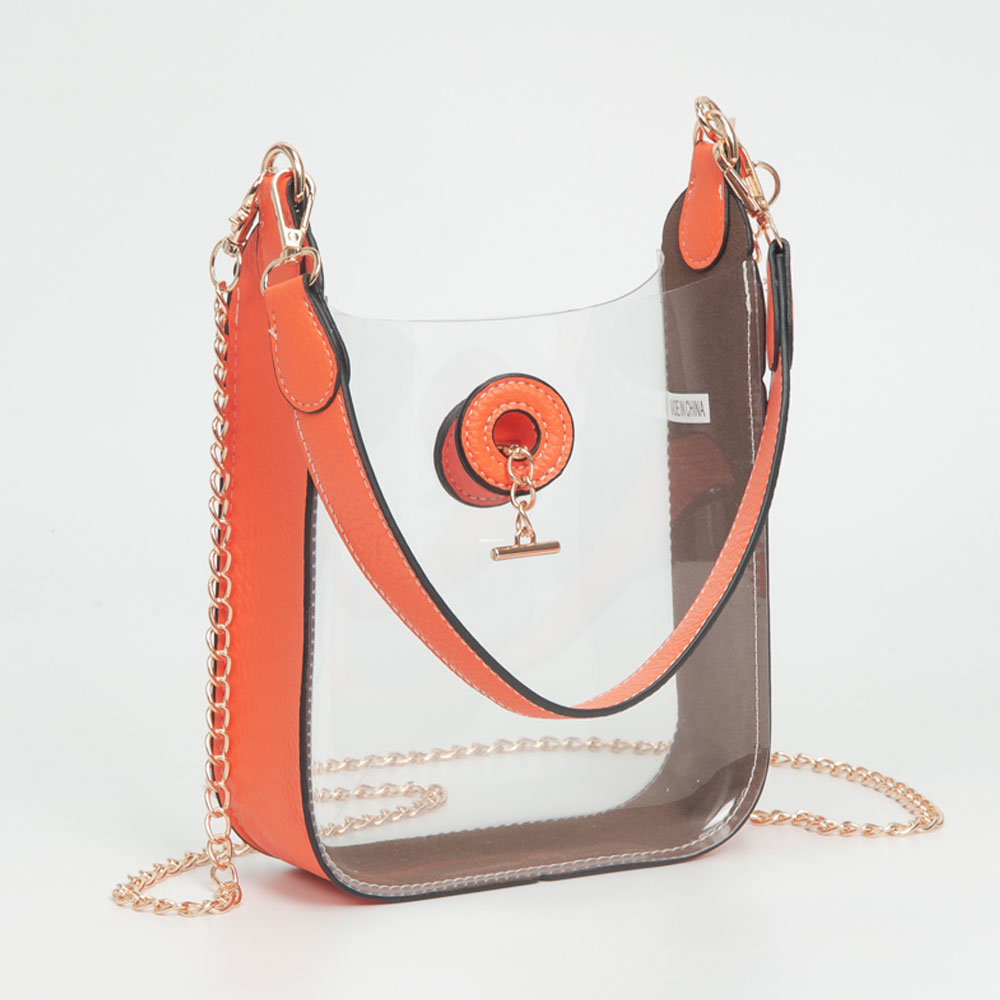 • This transparent chain shoulder bag blends modern minimalism with chic detailing. Featuring a clear structured body, secure clasp, and metallic chain strap, it’s perfect for concerts, events, or everyday outings, offering easy visibility and sleek sophistication in one stylish piece.