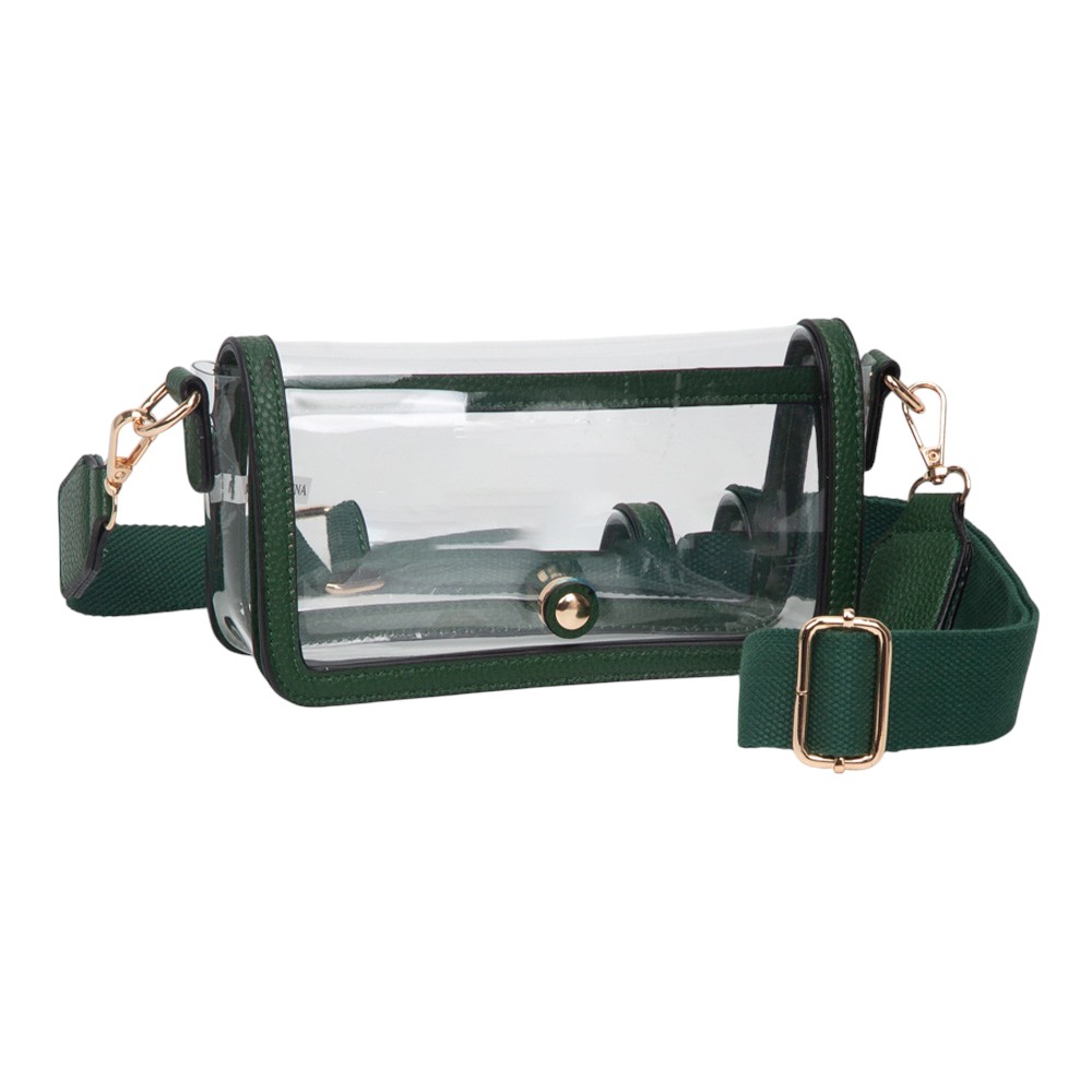 • Stay stylish and compliant with this clear stadium-approved crossbody bag, featuring black trim, secure snap closure, and an adjustable shoulder strap for comfort. Perfect for concerts, sporting events, festivals, and everyday use, offering convenience while meeting event regulations with ease.