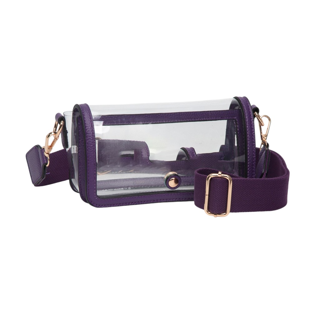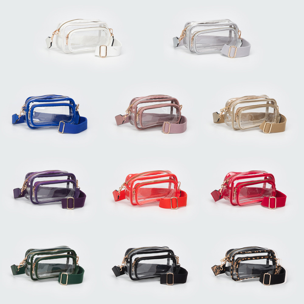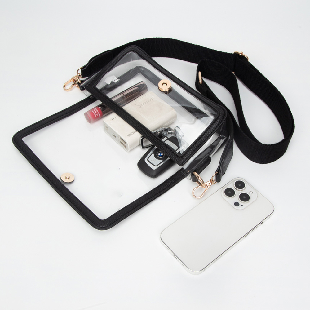 • Stay stylish and compliant with this clear stadium-approved crossbody bag, featuring black trim, secure snap closure, and an adjustable shoulder strap for comfort. Perfect for concerts, sporting events, festivals, and everyday use, offering convenience while meeting event regulations with ease.
