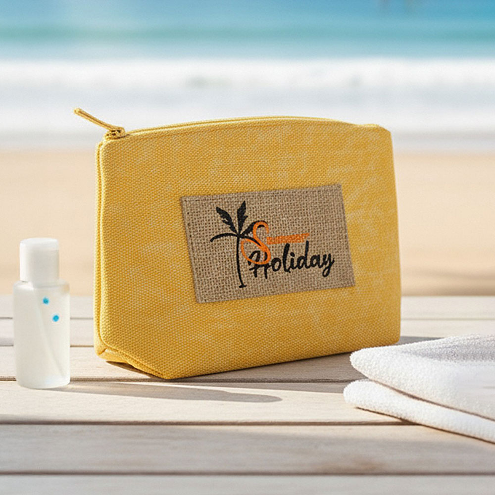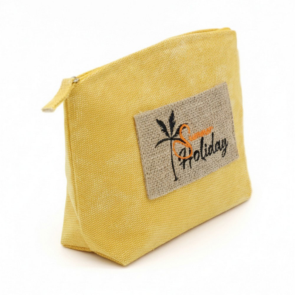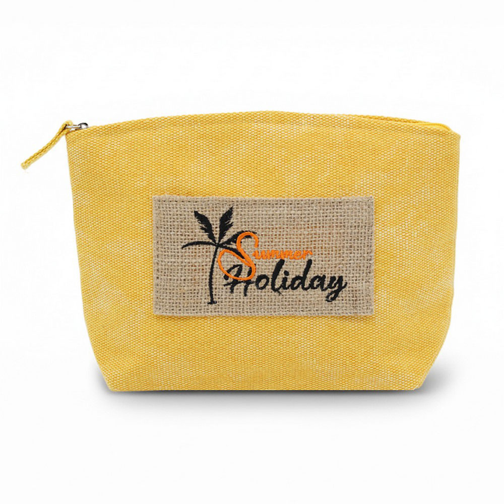Details • Size : 9.5" X 6" X 2.5" • Zipper Closure • Material : 80% Polyester, 20% Burlap • Compact zipper pouch designed for daily organization, travel, and seasonal gifting. Ideal for holding cosmetics, accessories, or small essentials, this lightweight pouch offers easy storage and a clean silhouette that fits perfectly in totes, beach bags, and handbags for warm-weather use.