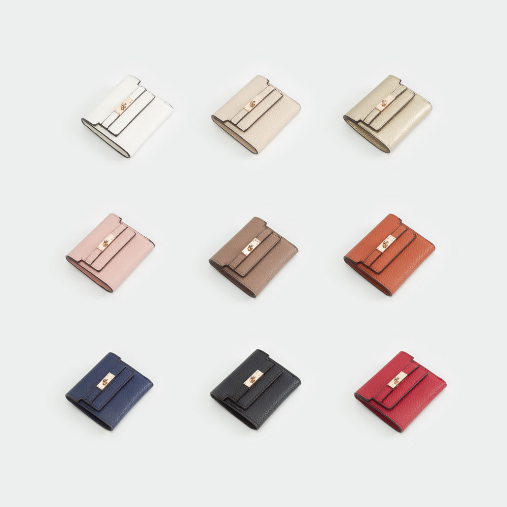 Details • Size : 4.25" X 3.75" X 1" • 5 Inside Card Slots • 1 Inside ID Window • 1 Inside Bill Compartment • 1 Outside Zipper Pocket • Snap Button Closure • This compact fold wallet with a sleek metal accent blends elegance with practicality. Designed with multiple card slots, an ID window, and a secure coin pocket, it keeps essentials neatly organized. Its refined structure makes it perfect for everyday use or travel convenience.