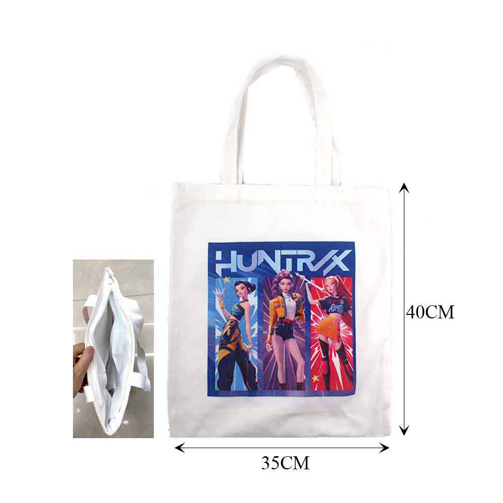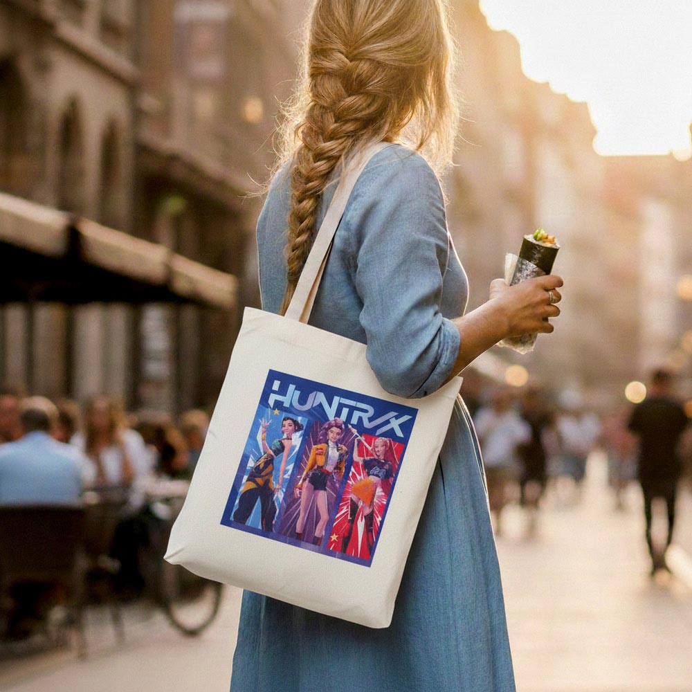 Details • Size : 12.6" X 14.5" • Top Handle Size : 10" L • Zipper Closure • Fan inspired graphic tote bag featuring the Huntrix group from K-Pop Demon Hunters. Designed for pop culture and animation fans, this reusable tote is ideal for shopping, school, travel, or daily errands. A functional carryall that showcases bold character artwork with collectible appeal.