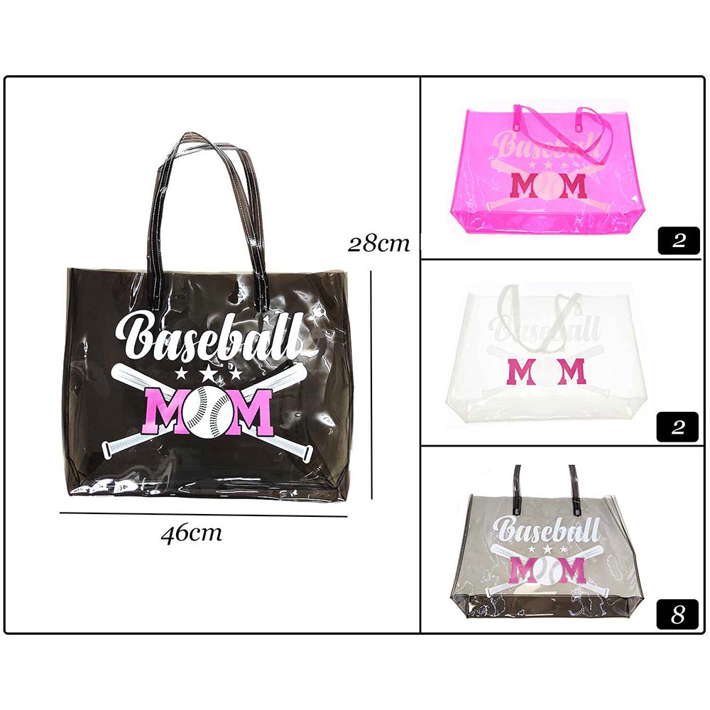 Details • Size : 18" X 11" • Top Handle Size : 9" L • A stylish clear tote bag featuring a bold “Baseball Mom” design, perfect for game days, shopping, travel, and everyday use. Offers roomy storage with comfortable handles, making it ideal for carrying essentials while showing sporty pride on the go.