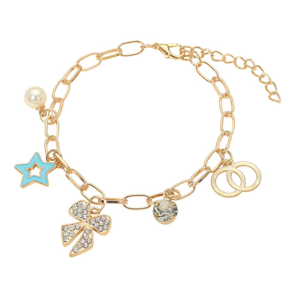 • This star and bow charm chain bracelet features playful symbolic charms including a star accent, bow detail, circular link charm, and crystal-style drop. Designed with an adjustable chain for a comfortable fit, it’s ideal for everyday wear, gifting, and boutique jewelry collections focused on charm-driven styling and versatile accessories.