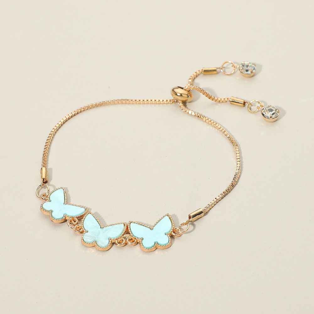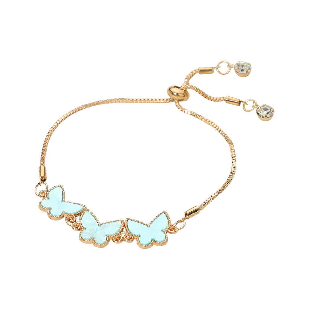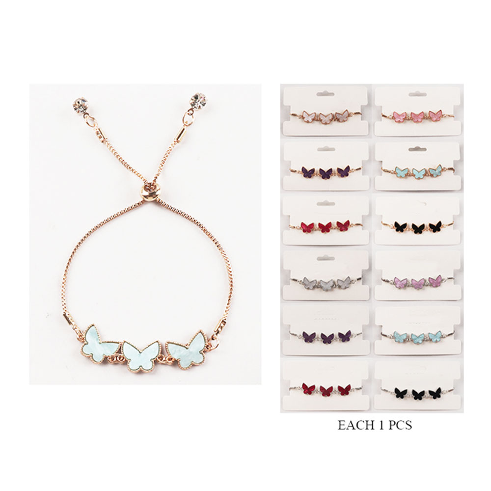 Details • Size : 0.5" H, 10" L • Adjustable • This adjustable bracelet features three graceful butterfly charms connected along a sleek, refined chain. Its sliding clasp ensures a perfect fit, making it easy to wear for any occasion. A charming piece that adds a soft, feminine touch and effortless elegance to everyday style.