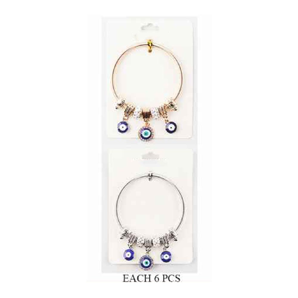 Details • Size : 0.2" H • Charm Size : 1.2" L • Stretchable • This evil eye charm bracelet features a flexible band design with layered bead accents and dangling evil eye symbols for eye-catching movement. A popular style for gift shops and trend-driven collections, it’s easy to stack, comfortable for daily wear, and ideal for everyday looks, seasonal assortments, and themed displays.