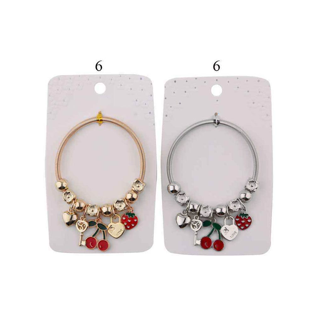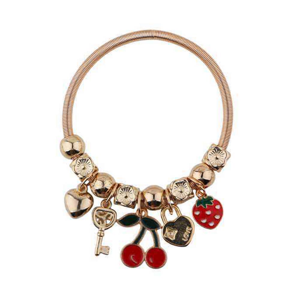 Details • Size : 0.3" H • Charm Size : 1" L • Stretchable • This fruit charm adjustable bracelet features a flexible band with playful dangle charms inspired by sweet fruit and symbolic motifs. Designed for easy wear and everyday styling, it adds a fun accent to casual looks, gifting, and seasonal collections. A charming accessory for stacking or wearing solo, perfect for boutiques seeking novelty jewelry with broad appeal.