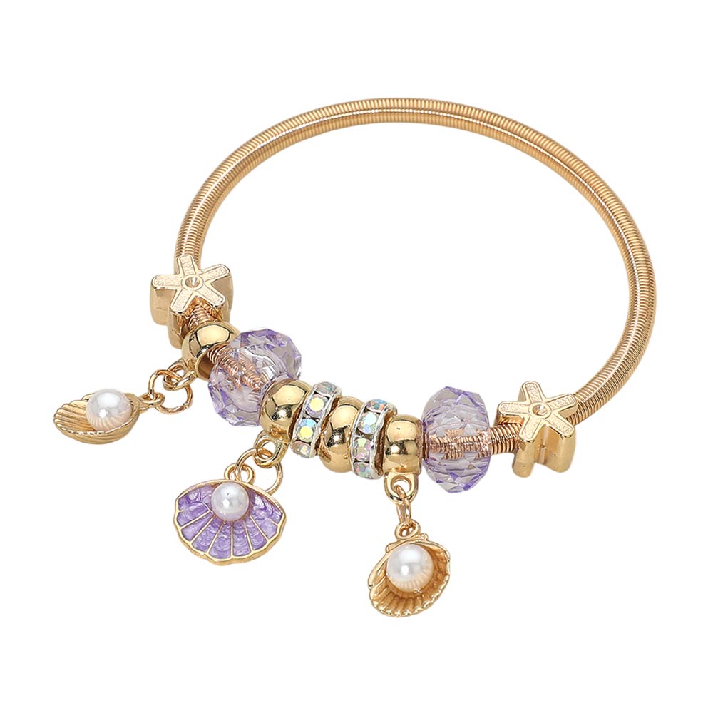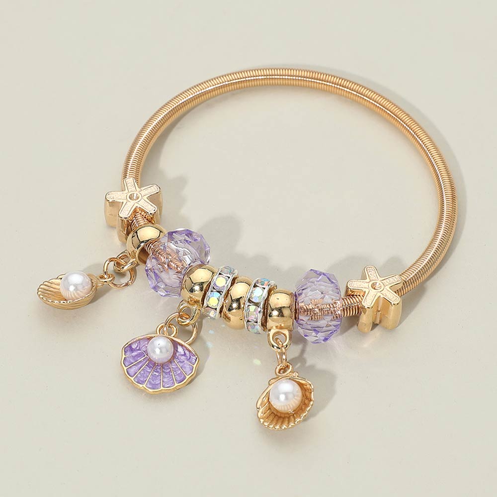 Details • Size : 1.6" H • Stretchable • This stretchable charm bracelet showcases a mix of seashell-inspired accents and decorative beads that create a playful yet elegant look. Designed for flexible sizing and comfortable wear, it’s perfect for everyday styling, resort themes, or gift displays, making it a versatile addition to boutique jewelry collections and seasonal assortments.