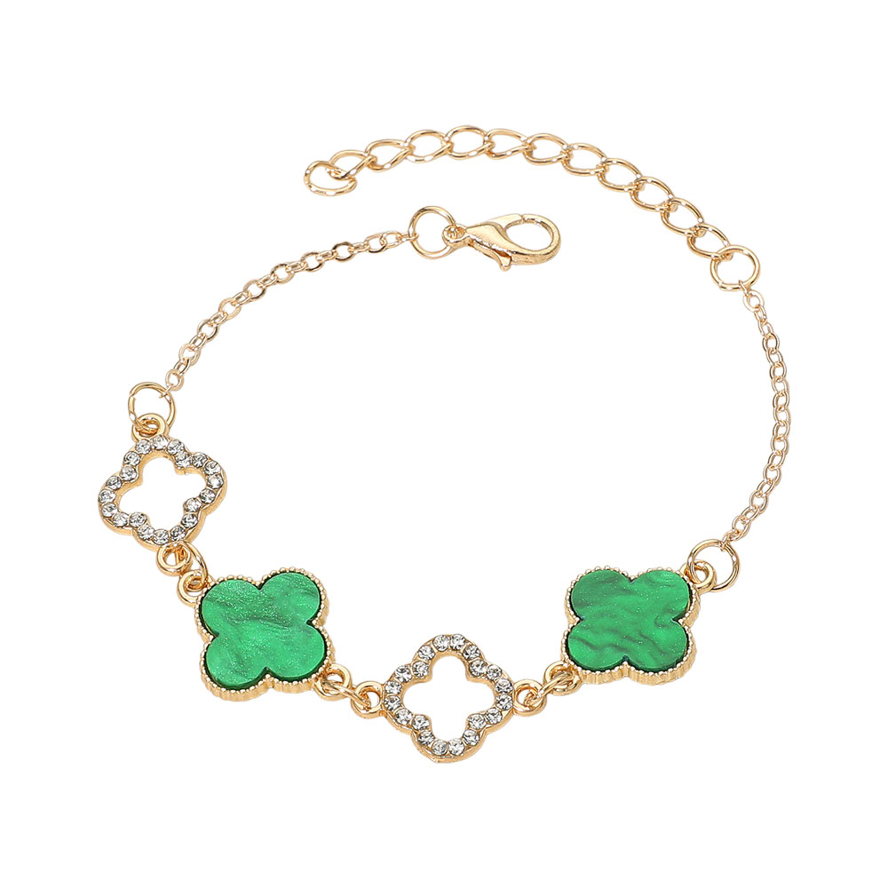 Details • Size : 0.6' H, 7" + 2" L • Lobster Clasp Closure • This elegant bracelet features a series of quatrefoil-shaped links, alternating between enamel and crystal-studded designs for a refined, balanced look. The adjustable chain ensures a comfortable fit, making it a perfect accessory for adding subtle sparkle and charm to any outfit.