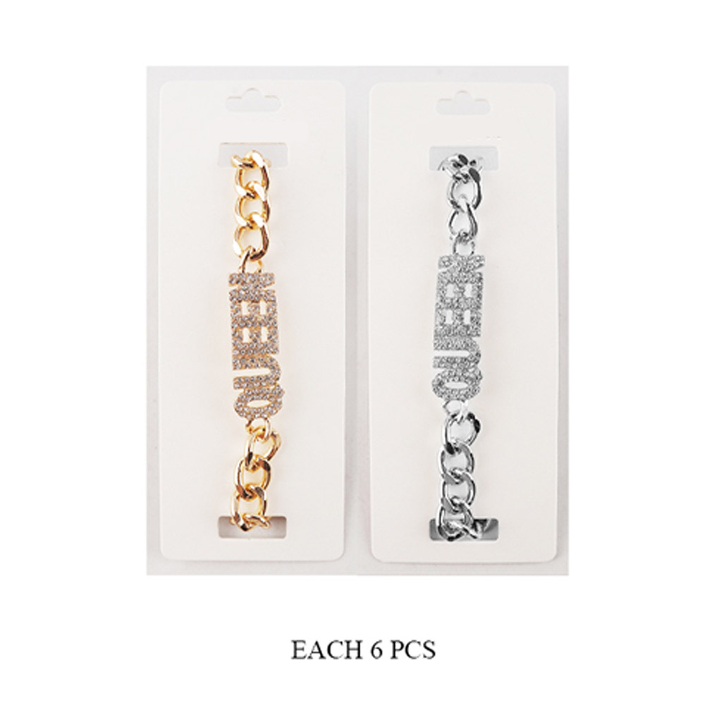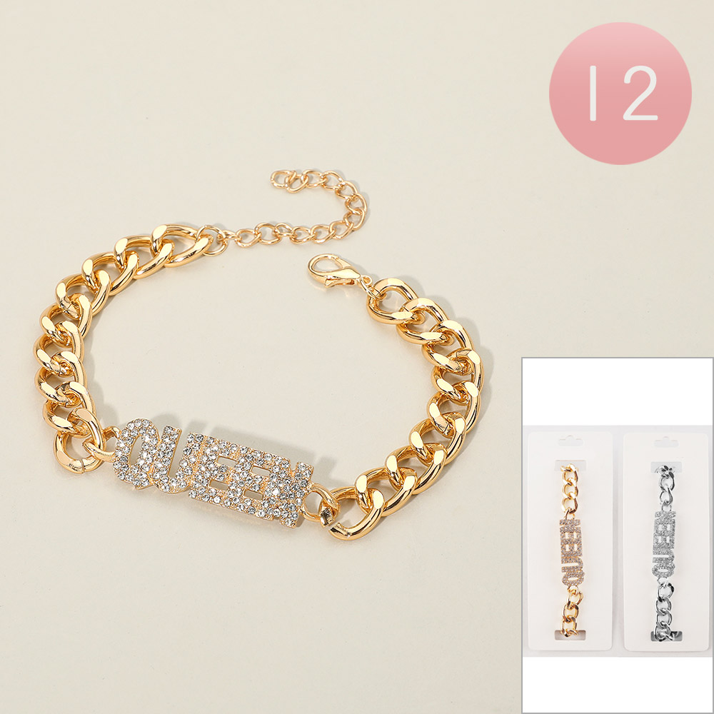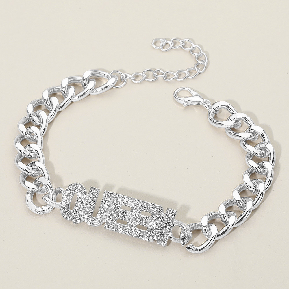 Details • Size : 0.5" H, 9.25" + 3" L • Lobster Clasp Closure • Make a confident style statement with this Queen Letter Bracelet. Featuring a chunky chain and dazzling rhinestone-studded “QUEEN” charm, it’s perfect for adding a touch of glam to any outfit. Ideal for gifting or showcasing your inner royalty with everyday elegance. • Lead and Nickel Compliant