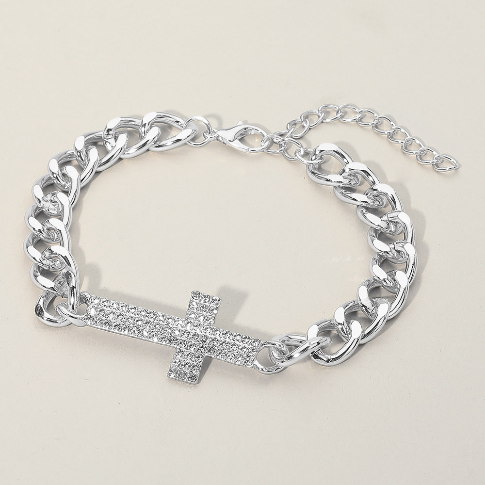 Details • Size : 0.8" H, 9.25" + 3" L • Lobster Clasp Closure • Add a refined touch to your look with this Cross Chain Bracelet, designed with a bold link chain and a sparkling rhinestone cross charm. Perfect for layering or wearing solo, this bracelet brings timeless elegance and modern sophistication to any outfit. • Lead and Nickel Compliant