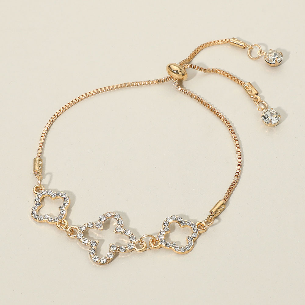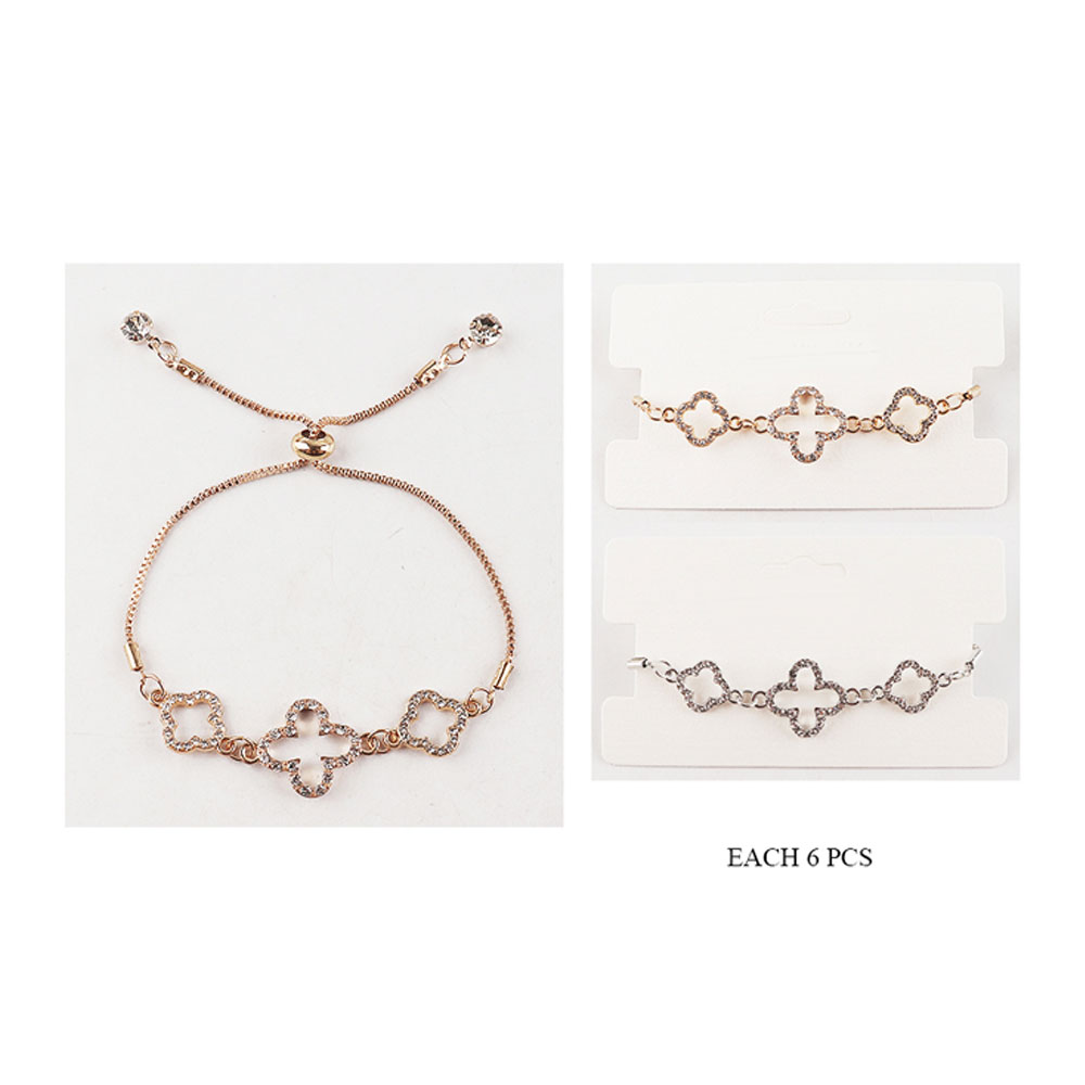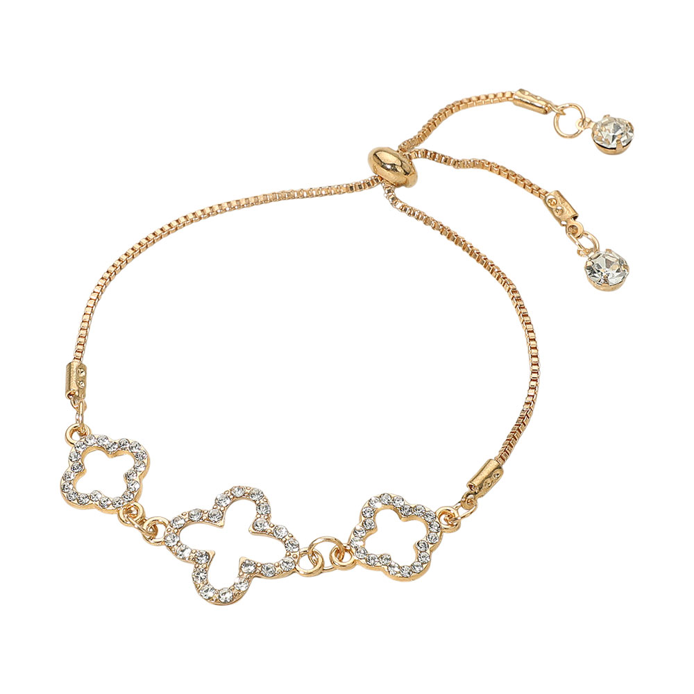 Details • Size : 0.7" H, 10" L • Adjustable • This adjustable bracelet showcases a trio of open quatrefoil-shaped charms accented with sparkling crystals for timeless elegance. Designed with a smooth sliding clasp for a perfect fit, it’s a refined piece that adds graceful shimmer and sophistication to both everyday and formal ensembles.