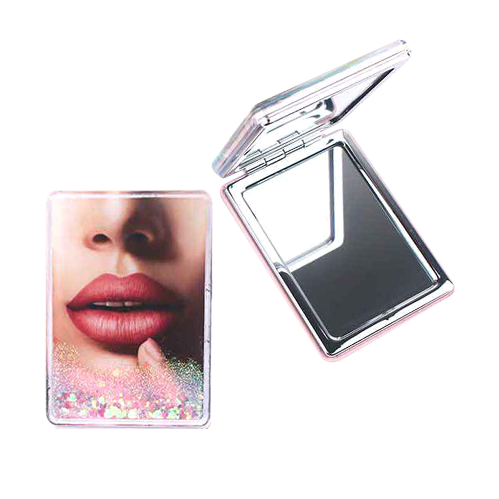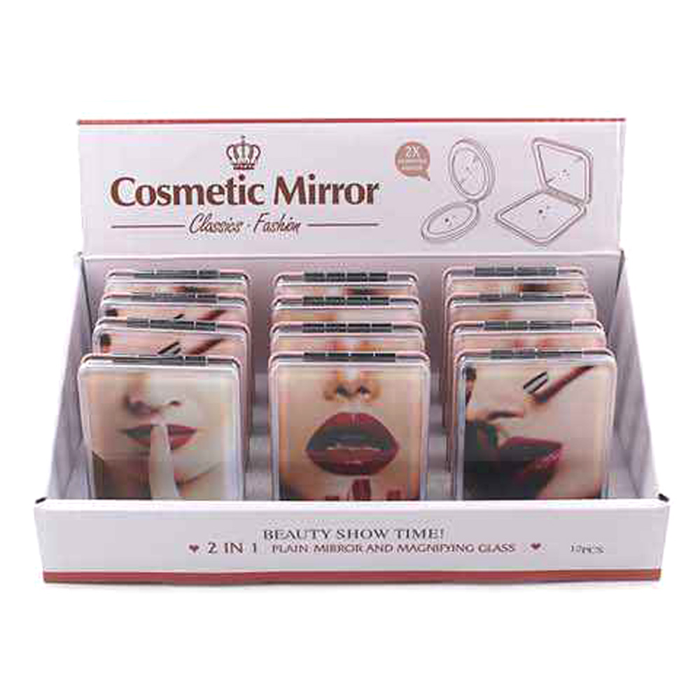 Details • Size : 2.4" X 3.3" • 2 In 1 - Plain Mirror And Magnifying Mirror • Compact folding makeup mirror with bold lip-art covers and floating glitter accents. Features two clear mirrors for quick touch-ups, fits easily in purses or pockets, and comes in assorted designs. Perfect for travel, daily use, or gifting with a stylish, modern look.