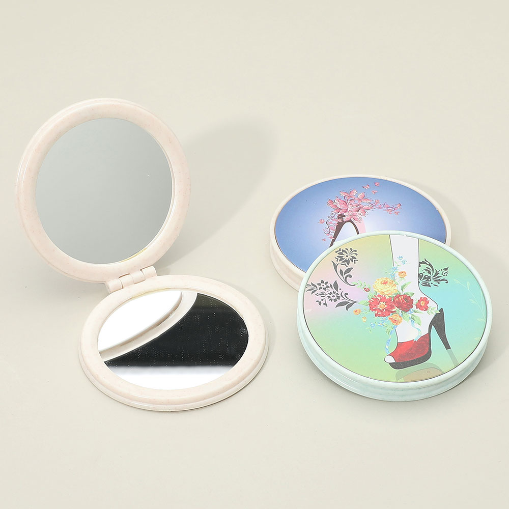 • High heel art compact mirror designed for quick touch-ups and everyday convenience. Features a clear reflective surface with a stylish illustrated cover in a slim, portable shape. Ideal for handbags, cosmetic pouches, gift shops, and impulse displays, offering decorative appeal combined with practical daily use.