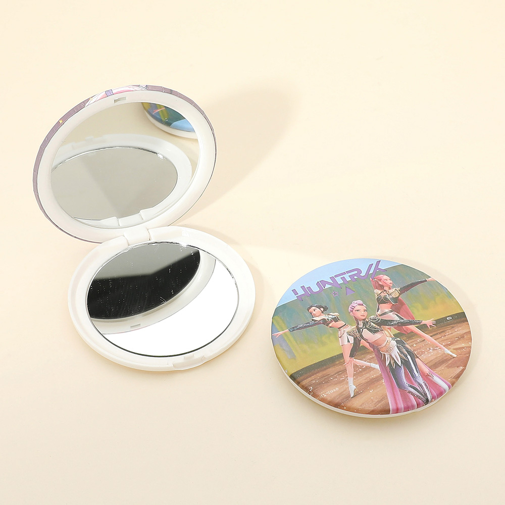 • Fan inspired round compact mirror featuring K-Pop Demon Hunters character artwork. Designed for quick touch ups at home or on the go, this portable mirror fits easily in bags or purses. A practical everyday accessory that combines function with collectible pop culture style for fans and gifting.