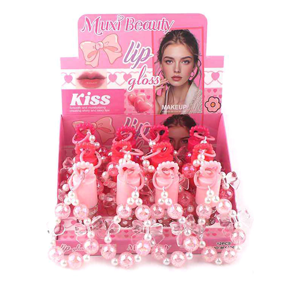 Details • Size : 3.5" L • Charm Size : 2.5" X 3.25" • Fun lip gloss accessory designed with a beaded bracelet and attached gloss charm for easy carrying. This playful beauty item combines fashion and function, making it perfect for party favors, gifts, or novelty displays. A trendy accessory that adds excitement to everyday routines and appeals to young beauty lovers.