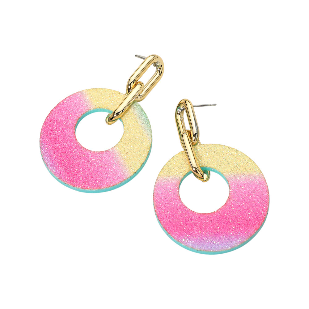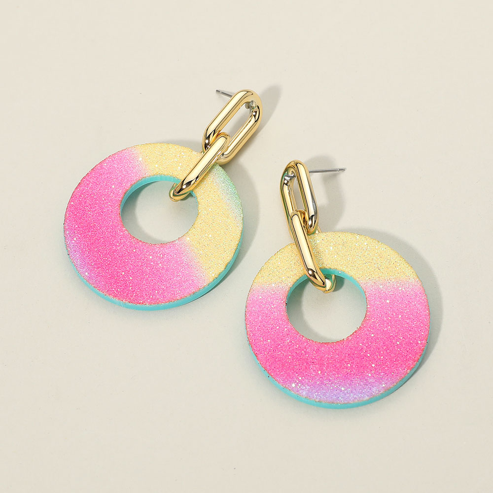• These gradient circle link dangle earrings feature a smooth circular design enhanced with subtle shimmer and a bold linked accent. Their playful gradient tones create a chic, modern statement perfect for parties, vacations, or adding a pop of style to everyday wear.