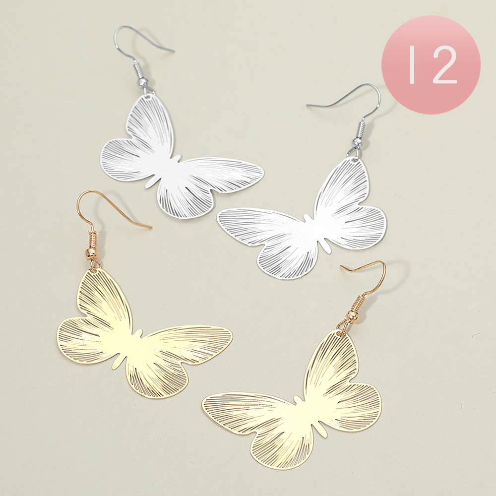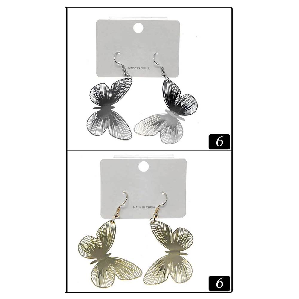 Details • Size : 1.5" X 2.25" • Fish Hook Back • Delicate butterfly drop earrings designed with finely etched wing details for a graceful, lightweight look. Add movement and charm to everyday outfits, vacations, events, and special occasions. Easy to wear and giftable, they bring a feminine, nature-inspired touch to modern accessory collections.